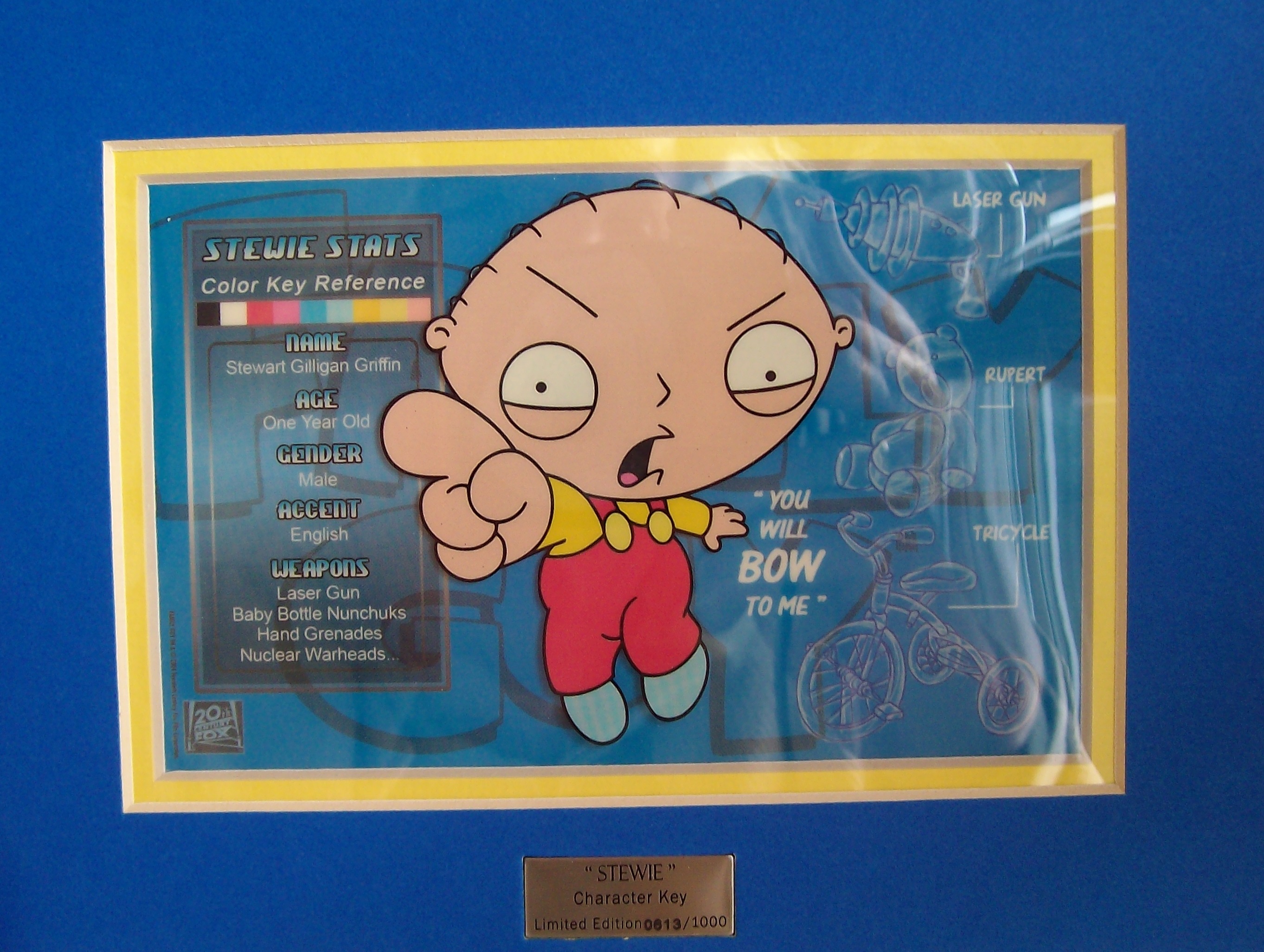The only conciliation is if the series that comes out is marvellous, even better than your idea. Which brings me to Stewie Griffin. I usually only collect animation production cels, but I made an exception for this little beauty.